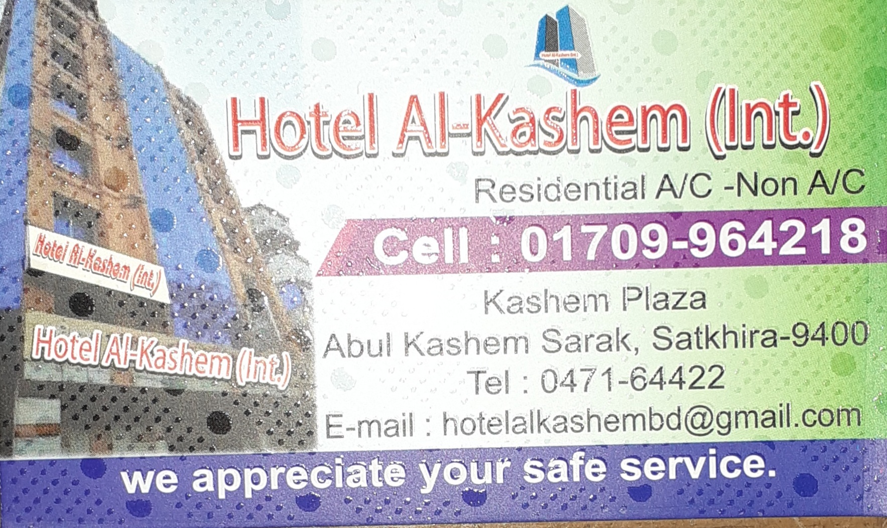Name Hotel Al Kashem (Int.) Business Hotel & Tourism Address Kashem PlazaAbul Kashem SarakSatkhira-9400 Mobile 01709-964218 Telephone 0471-64422 email hotelalkashembd@gmail.com