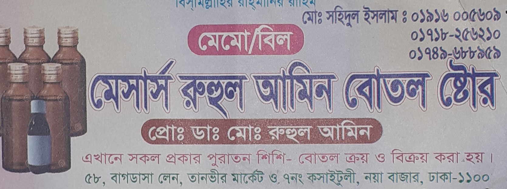 Name M/S. Ruhul Amin Bottle Store Business All Kinds of Glass Bottle Supplier Proprietor Md. Ruhul Amin Address 58 Bagdasa LaneTanvir Market& 7 KosaituliNayabazarDhaka-1100 District Dhaka Mobile 01916-00560901718-25621001749-688959